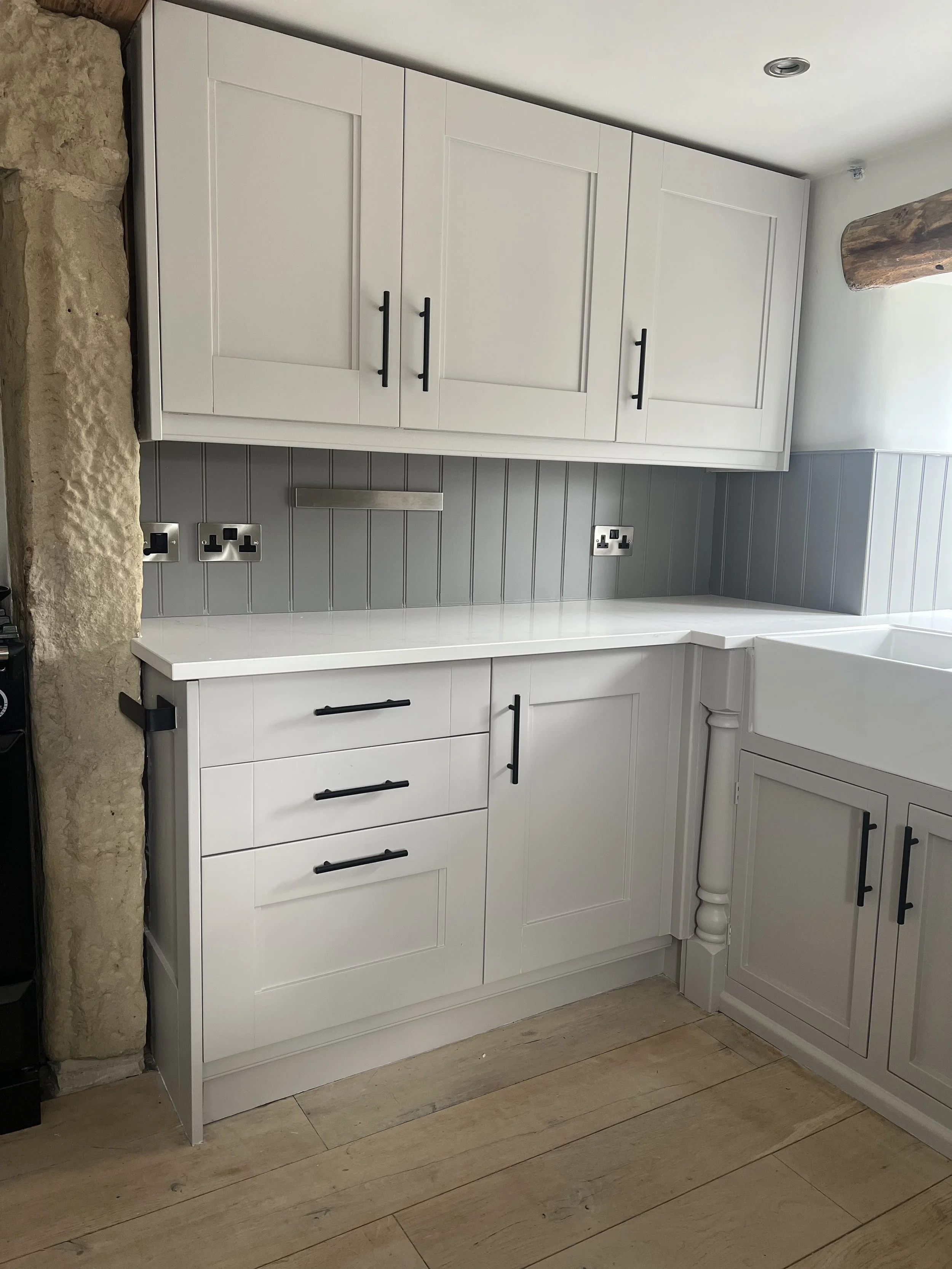 Hand painting this kitchen in Glusburn, West Yorkshire enhanced the look and protected it for many years to come. The monochrome colour scheme creates a backdrop allowing the customer to create different themes using soft decorations, such as tea towels, flowers and placemats and different colour appliances.