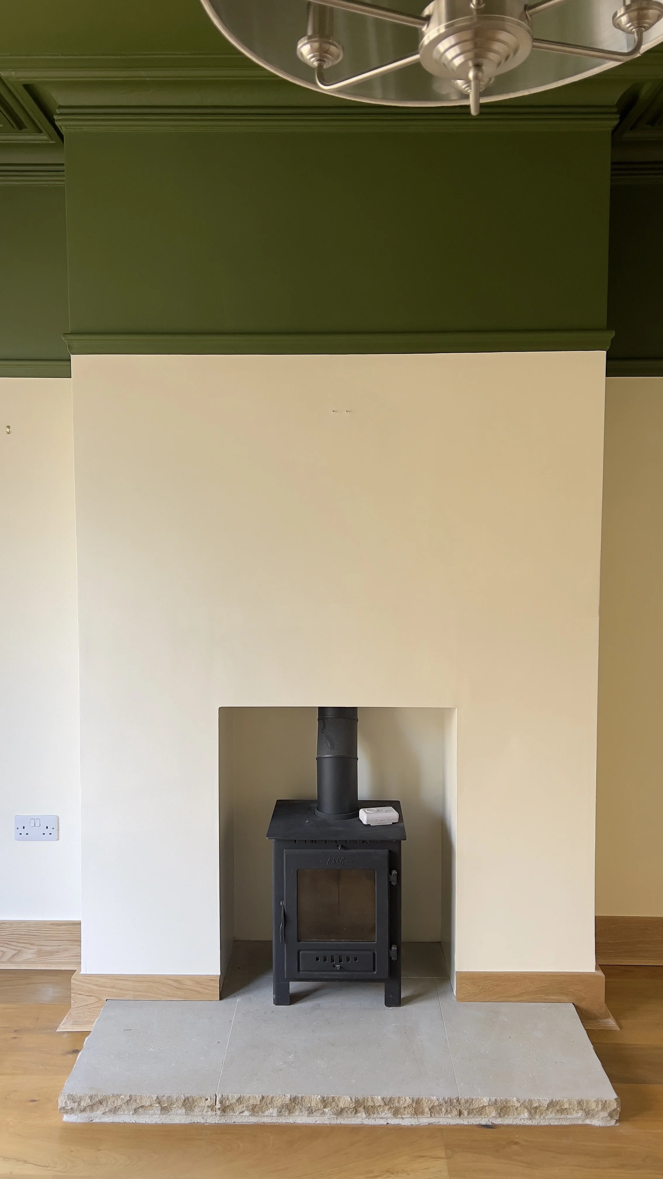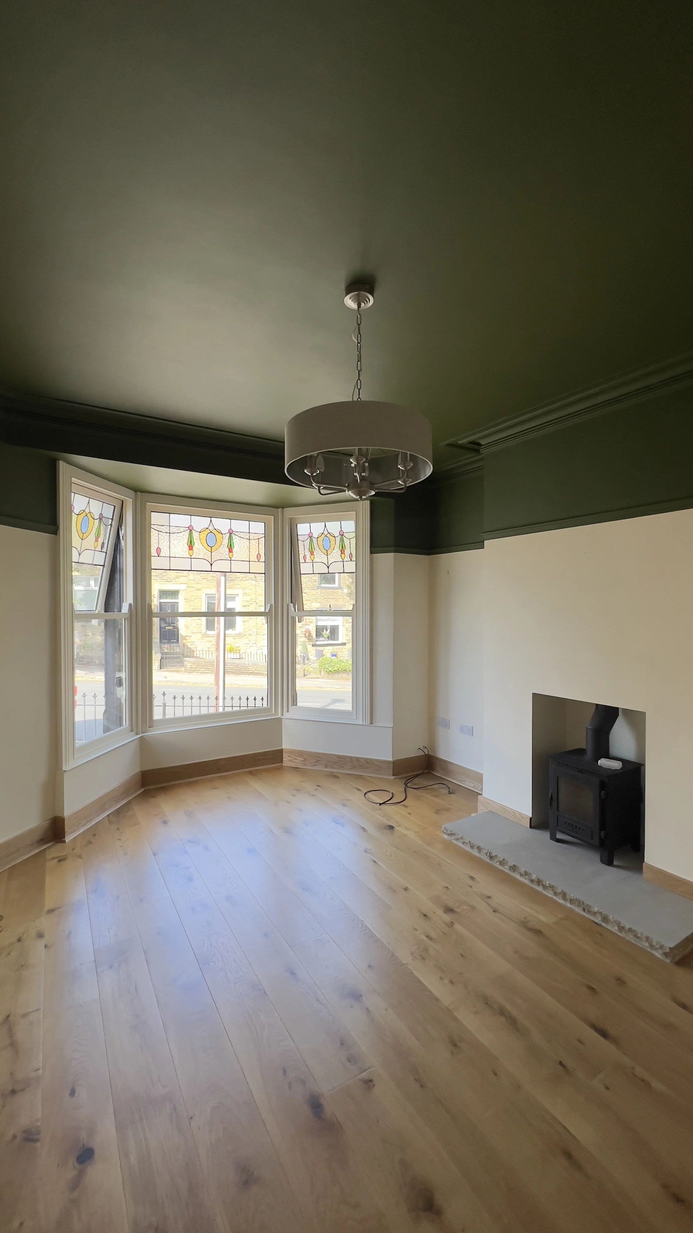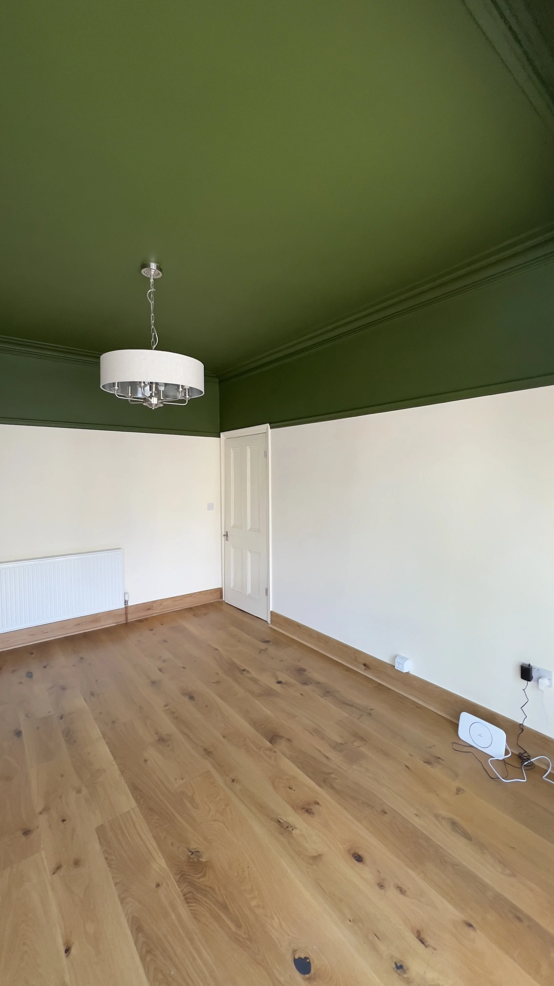 The bold and luxurious Jewel Beetle 303 colour from Little Greene, along with Tallow No. 203 from Farrow and ball created an elegant yet cosy atmosphere in this living room